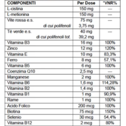 Con vite Rossa, Selenio, Zinco, Rame, Selenio, Vitamina E, Vitamine Gruppo B, Ferro, Coenzima Q10.