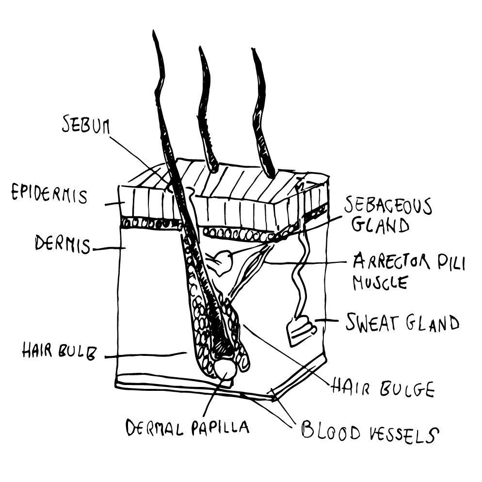 Il cuoio capelluto si estende dalla fronte alla nuca e ha a numero molto elevato di follicoli piliferi.