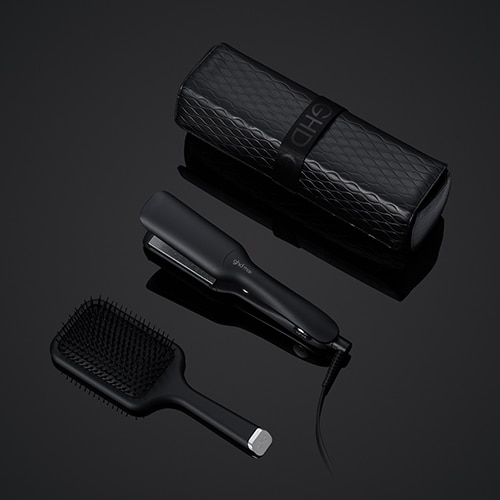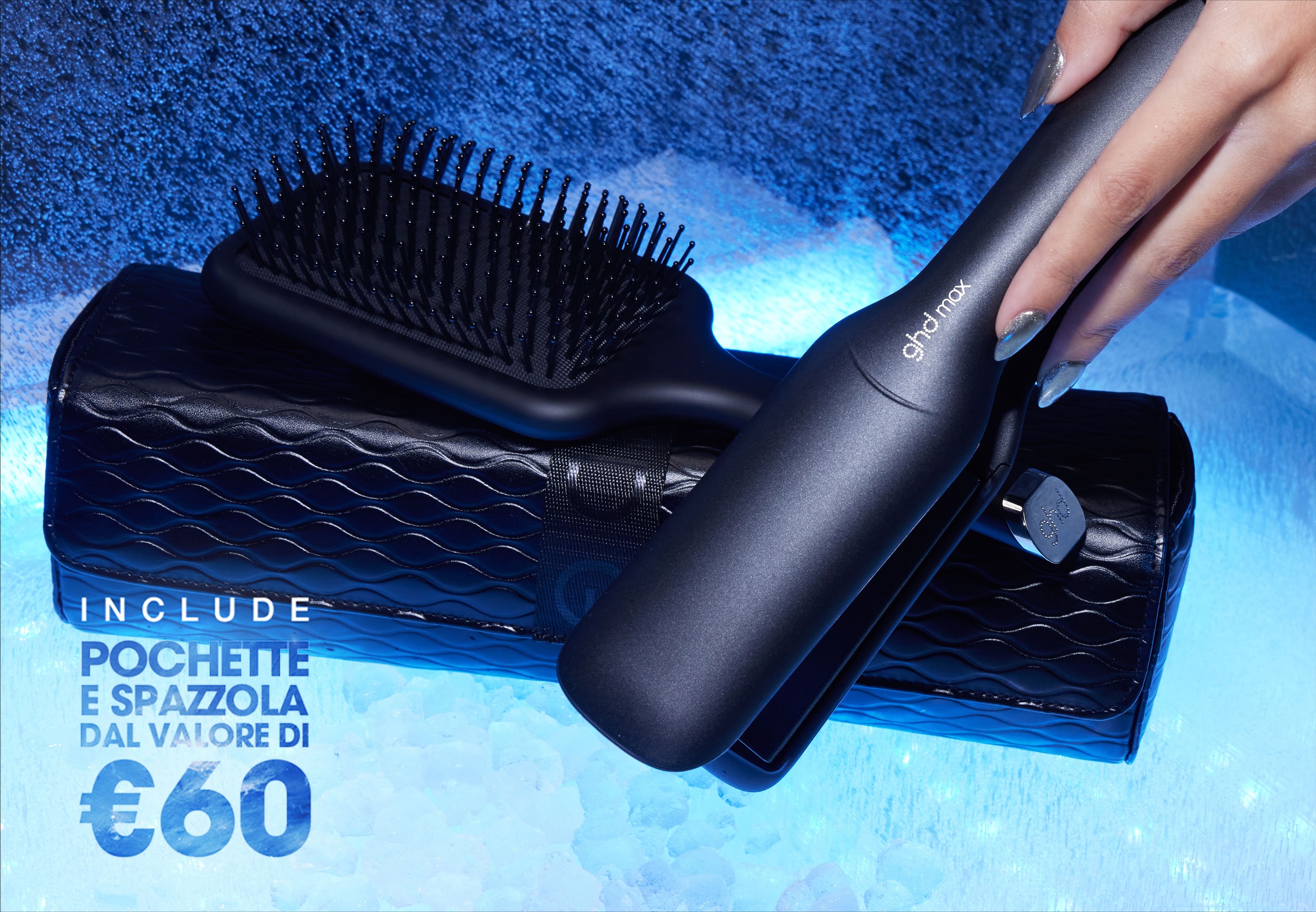 La nostra styler professionale a lamelle larghe ghd max è accompagnata da una pochette termoresistente e dalla spazzola piatta ghd paddle brush.